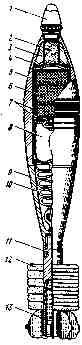 Рис. 11.2. 130-мм осветительная мина: 7—дистанционная трубка; 2—вышибной заряд; 3—вкладыш; 4 —диафрагма; 5—головная часть корпуса; 6 — факел с осветительным составом; 7—корпус факела: 8— парашют: 9— хвостовая часть корпуса; 10—шнур; //—трубка стабилизатора; 12— дополнительный заряд; 13— воспламенительный заряд
