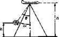 Рис. 12.5. Схема взаимного расположения НАФА, вспышки фотобомбы и фотографируемой местности: и—угол отставания ФОТАБ; а—половина угла зрения объектива НАФА; h— высота взрыва ФОТАБ; Н— высота полета самолета