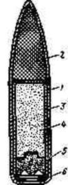 Рис. 13.1. Трассирующая пуля Т-30 образца 1930 г.: /—•пульная оболочка; 2-свиндовый сердечник; 3— стаканчик; 4— основной трассирующий состав; 5—воспламенитель-ный состав; 6— колечке
