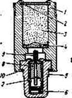 Рис. 13.3. Трассер механического воспламенения: I— корпус трассера; 2-дно; 3— основной трассирующий состав; 4— вос-пламенительный состав; 5— втулка; 6— капсюль-воспламенитель; 7—предохранитель; 8— ударник; 9—втулка с пороховым замедлителем; 10—свинцовое обтюрирующее кольцо