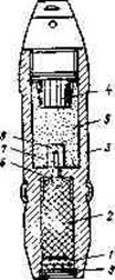 Рис. 13.9. Снаряд ОТ с самоликвидацией через трассер: /—воспламенительный сое тав; 2—трассирующий состав- 3—корпус снаряда; 4— взрыватель; 5—разрывной заряд; б— тепловой ликвидатор; 7—стержень; 8— детонатор; 9—целлулоидный кружок