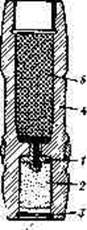 Рис. 13.10. Осколочно-за-жигательно - трассирующий зенитный снаряд с самоликвидацией через трассер: /—тепловой пиротехнический ликвидатор; 2—трассирующий состав; 3—целлулоидный кружок: 4— корпус снаряда: 5—шашка ВВ