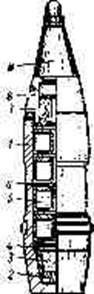 Рис. 15.8. Артиллерийский сегментный снаряд рассеивающего действия: 1—корпус; 2—донный вкладыш; 3—вышибной заряд; 4— диафрагма; 5— зажигательный сегмент; б—прокладка; 7—головной вкладыш; 8— головка; 9— дистанционная трубка