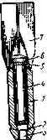 Рис. 15.9. Электронно-термитная ЗАБ-Э-1 [17]: /—«электронный корпус»; 2—газоотводные отверстия; 3—очко под взрыватель; 4—термитно-за-жигательная шашка; 5— картонные прокладки; 6— донная пробка; 7— стабилизатор