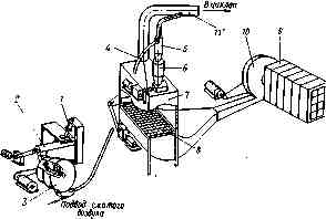 Бункер-накопитель 6, установленный над рабочим объемом сушилки 7, соединен с секторным питателем, который порционно подает продукт через механизм разбрасывания на сито 8 сушилки 7. Снизу сита 8, расположенного на решетке, подается горячий воздух вентилятором 10 из воздухоподогревателя 9. При подаче воздуха на сито 8 создается «кипящий» слой высушиваемого продукта. После удаления избыточной.влаги 'высушенный продукт через периодически открывающийся узел разгрузки, расположенный под ситом, просыпается, в приемную тару (на рис. 22.S не показана), а отработанный воздух по воздуховоду // поступает на очистку. Производительность агрегата — до 600 кг в час высушенного продукта. Объединение оборудования в единый агрегат позволяет существенно увеличить.коэффициент использования производственных площадей и ликвидировать ручную межоперационную транспортировку.