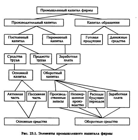 где Ко — время общего оборота стоимости авансированного промышленного капитала; ПК — стоимость авансированного промышленного капитала; ОК — стоимость основного капитала; ОБК — стоимость оборотного капитала; К1 — число оборотов основного капитала за год; К2 — число оборотов оборотного капитала за год. Предположим, что авансированный основной капитал фирмы составляет 100 млн. руб. и оборачивается за 10 лет. А ее авансированный оборотный капитал равняется 20 млн. руб. и делает два оборота в год. В таком случае фирме еже годно будет возвращаться в денежной форме 1/10 часть основного капитала и двукратная сумма оборотного капитала. А время общего оборота промышленного капитала составит Ко = 120: (100 * 0, 1 + 20 * 2) = 120: 50 = 2, 4 года. Время общего оборота капитала зависит от того, в каких пропорциях он делится на основной и оборотный. Чем больше удельный вес основного капитала во всем капитале, тем больше при прочих равных условиях время общего оборота капитала. В различных отраслях структура производительного капитала неодинакова. Поэтому скорость общего оборота различных индивидуальных капиталов фирм различна. По мере развития производства удельный вес основного капитала в совокупном объеме промышленного капитала фирмы увеличивается и возникает тенденция к замедлению общего оборота капитала. В конечном итоге структура промышленного капитала фирмы может быть представлена в виде рис. 23.1.