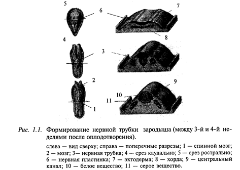 После слияния яйцеклетки со сперматозоидом (оплодотворения) новая клетка начинает делиться. Через некоторое время из этих новых клеток образуется пузырек. Одна стенка пузырька впячивается внутрь, и в результате образуется зародыш, состоящий из трех слоев клеток: самый внешний слой - эктодерма, внутренний - эндодерма и между ними - мезодерма. Нервная система развивается из наружного зародышевого листка - эктодермы. У человека в конце 2-й недели после оплодотворения обособляется участок первичного эпителия и образуется нервная пластинка. Ее клетки начинают делиться и дифференцироваться, вследствие чего они резко отличаются от соседних клеток покровного эпителия (рис. 1.1). В результате деления клеток края нервной пластинки приподнимаются и появляются нервные валики. В конце 3-й недели беременности края валиков смыкаются, образуя нервную трубку, которая постепенно погружается в мезодерму зародыша. На концах трубки сохраняются два нейропора (отверстия) - передний и задний. К концу 4-й недели нейропоры зарастают. Головной конец нервной трубки расширяется, и из него начинает развиваться головной мозг, а из оставшейся части - спинной мозг. На этой стадии головной мозг представлен тремя пузырями. Уже на 3 - 4-й неделе выделяются две области нервной трубки: дорсальная (крыловидная пластинка) и вентральная (базальная пластинка). Из крыловидной пластинки развиваются чувствительные и ассоциативные элементы нервной системы, из базальной - моторные. Структуры переднего мозга у человека целиком развиваются из крыловидной пластинки.