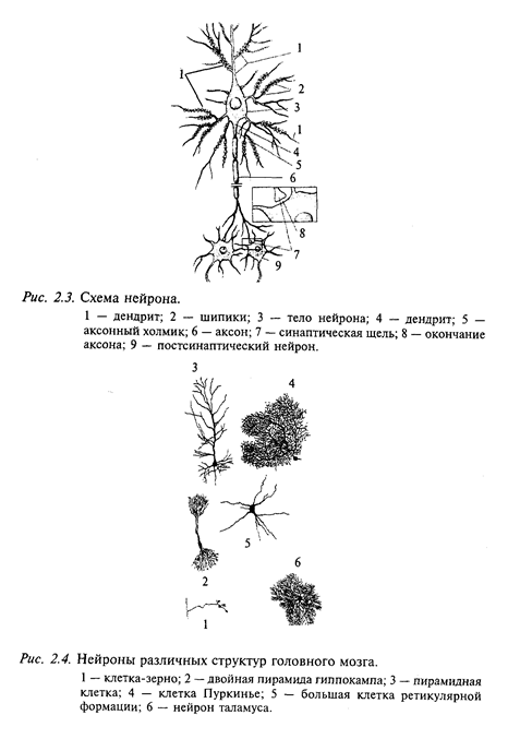 Нейрон является главной клеткой центральной нервной системы. Формы нейронов чрезвычайно многообразны, но основные части неизменны у всех типов нейронов. Нейрон состоит из следующих частей: сомы (тела) и многочисленных разветвленных отростков. У каждого нейрона есть два типа отростков: аксон, по которому возбуждение передается от нейрона к другому нейрону, и многочисленные дендриты (от греч. дерево), на которых заканчиваются синапсами (от греч. контакт) аксоны от других нейронов. Нейрон проводит возбуждение только от дендрита к аксону. Основным свойством нейрона является способность возбуждаться (генерировать электрический импульс) и передавать (проводить) это возбуждение к другим нейронам, мышечным, железистым и другим клеткам. На рис. 2.3 показана схема нейрона, на которой легко прослеживаются его основные части. Нейроны разных отделов мозга выполняют очень разнообразную работу, и в соответствии с этим форма нейронов из разных частей головного мозга также многообразна (рис. 2.4). Нейроны, расположенные на выходе нейронной сети какой-то структуры, имеют длинный аксон, по которому возбуждение покидает данную мозговую структуру. Например, нейроны двигательной коры головного мозга, так называемые пирамиды Беца (названные в честь киевского анатома Б. Беца, впервые их описавшего в середине XIX века), имеют у человека аксон около 1 м, он соединяет двигательную кору больших полушарий с сегментами спинного мозга. По этому аксону передаются «двигательные команды», например «пошевелить пальцами ноги». Как возбуждается нейрон? Основная роль в этом процессе принадлежит мембране, котораяотделяет цитоплазму клетки от окружающей среды. Мембрана нейрона, как и любой другой клетки, устроена очень сложно. В своей основе все известные биологические мембраны имеют однообразное строение (рис. 2.5): слой молекул белка, затем слой молекул липидов и еще один слой молекул белка. Вся эта конструкция напоминает два бутерброда, сложенных маслом друг к другу. Толщина такой мембраны составляет 7 - 11 нм. Чтобы представить эти размеры, вообразите, что толщина вашего волоса уменьшилась в 10 тыс. раз. В такую мембрану встроены разнообразные частицы. Одни из них являются частицами белка и пронизывают мембрану насквозь (интегральные белки), они образуют места прохождения для ряда ионов: натрия, калия, кальция, хлора. Это так называемые ионные каналы. Другие частицы прикреплены на внешней поверхности мембраны и состоят не только из молекул белка, но и из полисахаридов. Это рецепторы для молекул биологически активных веществ, например медиаторов, гормонов и др. Часто в состав рецептора, кроме места для связывания специфической молекулы, входит и ионный канал.