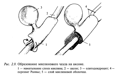 Возбуждение в виде потенциала действия покидает тело нейрона по его отростку, который называется аксоном. Аксоны отдельных нейронов обычно объединяются в пучки - нервы, а сами аксоны в этих пучках называются нервными волокнами. Природа позаботилась, чтобы волокна максимально хорошо справлялись с функцией проведения возбуждения в виде потенциалов действия. Для этой цели отдельные нервные волокна (аксоны отдельных нейронов) имеют специальные чехлы, выполненные из хорошего электрического изолятора (см. рис. 2.3). Чехол прерывается примерно через каждые 0, 5-1, 5 мм; это связано с тем, что отдельные участки чехла образуются в результате того, что специальные клетки в очень ранний период развития организма (в основном еще до рождения) обволакивают небольшие участки аксона. На рис. 2.9 показано, как это происходит. В периферических нервах миелин образуется клетками, которые получили название шванновских, а в головном мозге это происходит за счет клеток олигодендроглии.