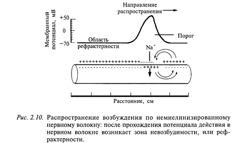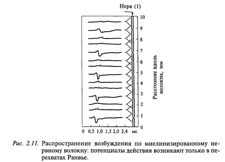 Как происходит распространение возбуждения по нервному волокну? Вначале разберем случай немиелинизированного нервного волокна. На рис. 2.10 показана схема нервного волокна. Возбужденный участок аксона характеризуется тем, что мембрана, обращенная к аксоплазме, заряжается положительно относительно экстраклеточной среды. Невозбужденные (покоящиеся) участки мембраны волокна отрицательны внутри. Между возбужденным и невозбужденным участками мембраны возникает разность потенциалов и начинает протекать ток. На рисунке это отражено линиями тока, пересекающими мембрану со стороны аксоплазмы, -выходящий ток, который деполяризует соседний невозбужденный участок волокна. Возбуждение движется по волокну только в одном направлении (показано стрелкой) и не может пойти в другую сторону, так как после возбуждения участка волокна в нем наступает рефрактерность - зона невозбудимости. Нам уже известно, что деполяризация приводит к открыванию потенциалзависимых натриевых каналов и в соседнем участке мембраны развивается потенциал действия. Затем натриевый канал инактивируется и закрывается, что и приводит к зоне невозбудимости волокна. Эта последовательность событий повторяется для каждого соседнего участка волокна. На каждое такое возбуждение тратится определенное время. Специальные исследования показали, что скорость проведения возбуждения немиелинизированных волокон пропорциональна их диаметру: чем больше диаметр, тем выше скорость движения импульсов. Например, немиелинизированные волокна, проводящие возбуждение со скоростью 100 - 120 м/с, должны иметь диаметр около 1000 мкм (1 мм). У млекопитающих животных природа сохранила немиелинизированными только те возбуждение о боли, температуре, управляют медленно работающими внутренними органами мочевым волокна, которые проводят органами - мочевым пузырем, кишечником и пр. Практически все нервные волокна в центральной нервной системе человека имеют миелиновые чехлы. На рис. 2.11 показано, что если вдоль волокна, покрытого миелином, регистрировать прохождение возбуждения, то потенциал действия возникает только в перехватах Ранвье. Оказывается, миелин, являясь хорошим электрическим изолятором, не пропускает выхода линий тока от предшествующего возбужденного участка. Выход тока в этом случае возможен только через те участки мембраны, которые находятся на стыке между двумя участками миелина. Напомним, что каждый участок образован только одной клеткой, поэтому это стыки между двумя клетками, образующими соседние участки миелиновой оболочки. Мембрана аксона между двумя соседними миелиновыми чехлами оказывается не покрытой миелином (так называемый перехват Ранвье). Благодаря такому устройству мембрана волокна возбуждается только в местах перехватов Ранвье. Вследствие этого потенциал действия (возбуждение) как бы перескакивает через участки изолированной мембраны. Другими словами, возбуждение движется скачками от перехвата к перехвату. Это похоже на те волшебные сапоги-скороходы, которые надевал кот в известной сказке, мгновенно переносясь из одного места в другое.
