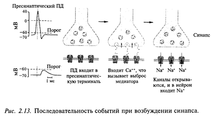 Вспомним, что нервный импульс (возбуждение) с огромной скоростью продвигается по волокну и подходит к синапсу. Этот потенциал действия вызывает деполяризацию мембраны синапса (рис. 2.13), однако это не приводит к генерации нового возбуждения (потенциала действия), а вызывает открывание специальных ионных каналов, с которыми мы еще не знакомы. Эти каналы пропускают ионы кальция внутрь синапса. Ионы кальция играют очень большую роль в деятельности организма. Специальная железа внутренней секреции - паращитовидная (она находится поверх щитовидной железы) регулирует содержание кальция в организме. Многие заболевания связаны с нарушением обмена кальция в организме. Например, его недостаток приводит к рахиту у маленьких детей.