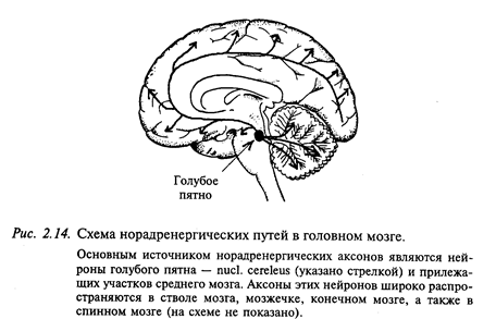 Основным источником норадренергических аксонов являются нейроны голубого пятна и прилежащих участков среднего мозга (рис. 2.14). Аксоны этих нейронов широко распространяются в мозговом стволе, мозжечке, в больших полушариях. В продолговатом мозге крупное скопление норадренергических нейронов находится в вентролатеральном ядре ретикулярной формации. В промежуточном мозге (гипоталамусе) норадренергические нейроны наряду с дофаминергическими нейронами входят в состав гипоталамо-гипофизарной системы. Норадренергические нейроны в большом количестве содержатся в нервной периферической системе. Их тела лежат в симпатической цепочке и в некоторых интрамуральных ганглиях. Дофаминергические нейроны у млекопитающих находятся преимущественно в среднем мозге (так называемая нигро-неостриарная система), а также в гипоталамической области. Дофаминовые цепи мозга млекопитающих хорошо изучены. Известны три главные цепи, все они состоят из однонейронной цепочки. Тела нейронов находятся в мозговом стволе и отсылают аксоны в другие области головного мозга (рис. 2.15).