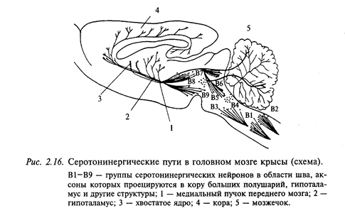 Одна цепь очень проста. Тело нейрона находится в области гипоталамуса и отсылает короткий аксон в гипофиз. Этот путь входит в состав гипоталамо-гипофизарной системы и контролирует систему эндокринных желез. Вторая дофаминовая система также хорошо изучена. Это черная субстанция, многие клетки которой содержат дофамин. Аксоны этих нейронов проецируются в полосатые тела. Эта система содержит примерно 3/4 дофамина головного мозга. Она имеет решающее значение в регулировании тонических движений. Дефицит дофамина в этой системе приводит к болезни Паркинсона. Известно, что при этом заболевании происходит гибель нейронов черной субстанции. Введение L-DOPA (предшественника дофамина) облегчает у больных некоторые симптомы заболевания. Третья дофаминергическая система участвует в проявлении шизофрении и некоторых других психических заболеваний. Функции этой системы пока изучены недостаточно, хотя сами пути хорошо известны. Тела нейронов лежат в среднем мозге рядом с черной субстанцией. Они проецируют аксоны в вышележащие структуры мозга, мозговую кору и лимбическую систему, особенно к фронтальной коре, к септальной области и энторинальной коре. Энторинальная кора, в свою очередь, является главным источником проекций к гиппокампу. Согласно дофаминовой гипотезе шизофрении, третья дофаминергическая система при этом заболевании сверхактивна. Эти представления возникли после открытия веществ, снимающих некоторые симптомы заболевания. Например, хлорпромазин и галоперидол имеют разную химическую природу, но они одинаково подавляют активность дофаминергической системы мозга и проявление некоторые симптомов шизофрении. У больных шизофренией, в течение года получавших эти препараты, появляются двигательные нарушения, получившие название tardive dyskinesia (повторяющиеся причудливые движения лицевой мускулатуры, включая мускулатуру рта, которые больной не может контролировать). Серотонин почти одновременно открыли в качестве сывороточного сосудосуживающего фактора (1948) и энтерамина, секретируемого энтерохромаффиновыми клетками слизистой оболочки кишечника. В 1951 г. было расшифровано химическое строение серотонина и он получил новое название - 5-гидрокситриптамин. В организме млекопитающих он образуется гидроксилированием аминокислоты триптофана с последующим декарбоксилированием. 90% серотонина образуется в организме энтерохромаффиновыми клетками слизистой оболочки всего пищеварительного тракта. Внутриклеточный серотонин инактивируется моноаминоксидазой, содержащейся в митохондриях. Серотонин внеклеточного пространства окисляется перулоплазмином. Большая часть вырабатываемого серотонина связывается с кровяными пластинками и по кровяному руслу разносится по организму. Другая часть действует в качестве местного гормона, способствуя авторегулированию кишечной перистальтики, а также модулируя эпителиальную секрецию и всасывание в кишечном тракте.
