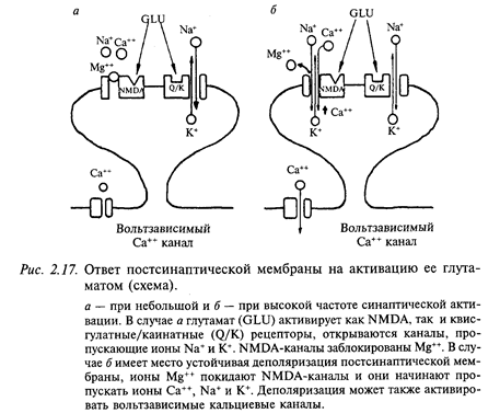 Серотонинергические нейроны широко распространены в центральной нервной системе (рис. 2.16). Они обнаруживаются в составе дорсального и медиального ядер шва продолговатого мозга, а также в среднем мозге и варолиевом мосту. Серотонинергические нейроны иннервируют обширные области мозга, включающие кору больших полушарий, гиппокамп, бледный шар, миндалину, область гипоталамуса. Интерес к серотонину был привлечен в связи с проблемой сна. При разрушении ядер шва животные страдали бессонницей. Сходный эффект оказывали вещества, истощающие хранилище серотонина в мозге. Самая высокая концентрация серотонина обнаружена в эпифизе (pineal gland). Серотонин в эпифизе превращается в мелатонин, который участвует в пигментации кожи, а также влияет у многих животных на активность женских гонад. Содержание как серотонина, так и мелатонина в эпифизе контролируется циклом свет - темнота через нервную симпатическую систему. Другую группу медиаторов ЦНС составляют аминокислоты. Уже давно известно, что нервная ткань с ее высоким уровнем метаболизма содержит значительные концентрации целого набора аминокислот (перечислены в порядке убывания): глутаминовой кислоты, глутамина, аспарагиновой кислоты, гамма-аминомасляной кислоты (ГАМК). Глутамат в нервной ткани образуется преимущественно из глюкозы. У млекопитающих больше всего глутамата содержится в конечном мозге и мозжечке, где его концентрация примерно в 2 раза выше, чем в стволе мозга и спинном мозге. В спинном мозге глутамат распределен неравномерно: в задних рогах он находится в большей концентрации, чем в передних. Глутамат является одним из самых распространенных медиаторов в ЦНС. Постсинаптические рецепторы к глутамату классифицируются в соответствии с аффинностью (сродством) к трем экзогенным агонистам - квисгулату, каинату и N-метил-D-аспартату (NMDA). Ионные каналы, активируемые квисгулатом и каинатом, подобны каналам, которые управляются никотиновыми рецепторами - они пропускают смесь катионов (Na+ и. К+). Стимуляция NMDA-рецепторов имеет сложный характер активации: ионный ток, который переносится не только Na+ и К+, но также Са++ при открывании ионного канала рецептора, зависит от потенциала мембраны. Вольтзависимая природа этого канала определяется разной степенью его блокирования ионами Mg++ с учетом уровня мембранного потенциала. При потенциале покоя порядка - 75 мВ ионы Mg++, которые преимущественно находятся в межклеточной среде, конкурируют с ионами Са++ и Na+ за соответствующие каналы мембраны (рис. 2.17). Вследствие того, что ион Mg++ не может пройти через пору, канал блокируется всякий раз, как попадает туда ион Mg++. Это приводит к уменьшению времени открытого канала и проводимости мембраны. Если мембрану нейрона деполяризовать, то количество ионов Mg++, которые закрывают ионный канал, снижается и через канал беспрепятственно могут проходить ионы Са++, Na+ и. К+. При редких стимуляциях (потенциал покоя изменяется мало) глутаматергического рецептораВПСП возникает преимущественно за счет активации квисгулатных и каинатных рецепторов; вклад NMDA-рецепторов незначителен. При длительной деполяризации мембраны (ритмическая стимуляция) магниевый блок удаляется, и NMDA-каналы начинают проводить ионы Са++, Na+ и. К+. Ионы Са++ через вторичные посредники могут потенцировать (усиливать) минПСП, что может привес