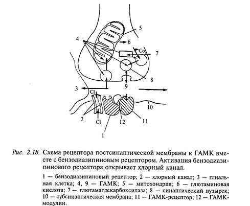 Из тормозных медиаторов ГАМК является самой распространенной в ЦНС. Она синтезируется из L-глутаминовой кислоты в одну стадию ферментом декарбоксилазой, наличие которой является лимитирующим фактором этого медиатора. Известно два типа ГАМК-рецепторов на постсинаптической мембране: ГАМКА (открывает каналы для ионов хлора) и ГАМКБ (открывает в зависимости от типа клетки каналы для. К+ или Са++). На рис. 2.18 показана схема ГАМК-рецептора. Интересно, что в его состав входит бензодиазипиновый рецептор, наличием которого объясняют действие так называемых малых (дневных) транквилизаторов (седуксена, тазепама и др.). Прекращение действия медиатора в ГАМК-синапсах происходит по принципу обратного всасывания (молекулы медиатора специальным механизмом поглощаются из синаптической щели в цитоплазму нейрона). Из антагонистов ГАМК хорошо известен бикукулин. Он хорошо проходит через гематоэнцефалический барьер, оказывает сильное воздействие на организм даже в малых дозах, вызывая конвульсии и смерть. ГАМК обнаруживается в ряде нейронов мозжечка (в клетках Пуркинье, клетках Гольджи, корзинчатых клетках), гиппокампа (в корзинчатых клетках), в обонятельной луковице и черной субстанции. Идентификация ГАМК-цепей мозга трудна, так как ГАМК - обычный участник метаболизма в ряде тканей организма. Метаболическая ГАМК не используется как медиатор, хотя в химическом отношении их молекулы одинаковы. ГАМК определяется по ферменту декарбоксилазы. Метод основан на получении у животных антител к декарбоксилазе (антитела экстрагируют, метят и вводят в мозг, где они связываются с декарбоксилазой).