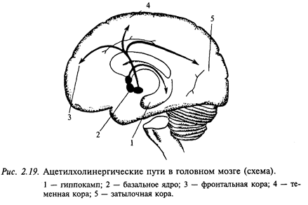 Ацетилхолин - один из первых изученных медиаторов. Он чрезвычайно широко распространен в нервной периферической системе. Примером могут служить мотонейроны спинного мозга и нейроны ядер черепных нервов. Как правило, холинергические цепи в мозге определяют по присутствию фермента холинэстеразы. В головном мозге тела холинергических нейронов находятся в ядре перегородки, ядре диагонального пучка (Брока) и базальных ядрах. Нейроанатомы считают, что эти группы нейронов формируют фактически одну популяцию холинергических нейронов: ядро педнего мозга, nucleus basalis (оно расположено в базальной части переднего мозга) (рис. 2.19). Аксоны соответствующих нейронов проецируются к структурам переднего мозга, особенно в новую кору и гиппокамп. Здесь встречаются оба типа ацетилхолиновых рецепторов (мускариновые и никотиновые), хотя считается, что мускариновые рецепторы доминируют в более рострально распоженных мозговых структурах. По данным последних лет складывается впечатление, что ацетилхолиновая система играет большую роль в процессах, связанных с высшими интегративными функциями, которые требуют участия памяти. Например, показано, что в мозге больных, умерших от болезни Альцгеймера, наблюдается массивная утрата холинергических нейронов в nucleus basalis.