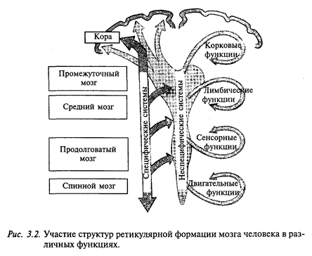 Какие же структуры мозгового ствола кошки могут быть ответственны за состояние бодрствования? Это структуры ретикулярной формации, или сетчатой формации. Ретикулярная формация мозгового ствола была описана еще в прошлом столетии русским ученым В. М. Бехтеревым (1898) и испанским ученым Рамон-и-Кахалем (1909) как диффузное скопление нейронов, пронизанное многочисленными нервными волокнами и занимающее срединное положение в мозговом стволе. В настоящее время в составе ретикулярной формации мозга человека описано более 100 ядер.