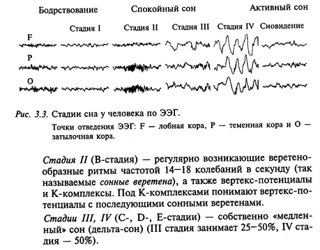 Для ретикулярной формации характерным является то, что многочисленные нейроны образуют как бы диффузную сеть (лат. Reticulae - сеть, отсюда и название всей структуры головного мозга), которая пронизана большим числом волокон, идущих от сенсорных ядер мозгового ствола (ядра черепных нервов). Аксоны нейронов ретикулярной формации направляются вверх к коре больших полушарий, а также вниз к нейронам спинного мозга (рис. 3.2). Более того, сама ретикулярная формация мозгового ствола получает волокна от ряда структур головного мозга, в том числе от коры больших полушарий, и спинного мозга. Сейчас принята гипотеза, что в норме «ретикулярный разряд» запускает корковые механизмы бодрствования, которые, в свою очередь, регулируют тонус ретикулярной формации ствола. Основываясь на этом, можно объяснить и результаты опытов в лаборатории И.П.Павлова, когда собаки засыпали при действии монотонных раздражителей. Эти раздражители возбуждают нейроны коры, которые, воздействуя на ретикулярную формацию ствола, и приводят к засыпанию собаки. Действительно, оказалось, что в состав ретикулярной формации мозгового ствола входят не только структуры, при возбуждении которых животное просыпается и становится активным (настораживание, принюхивание и пр.), но и структуры, активация которых вызывает засыпание животного. Это ядра шва. В окончаниях своих аксонов (синапсах) нейроны этих ядер выделяют серотонин. В опытах на животных было показано, что локальное разрушение этих ядер приводит к хронической бессоннице животного, которая может заканчиваться смертью. Известно, что истощение серотонина мозга у человека также приводит к хронической бессоннице. В настоящее время известно, что сон не является однородным состоянием головного мозга. В 1953 г. американские исследователи Азеринский и Клейтман открыли феномен «быстрого сна». Этот феномен состоял в том, что медленноволновый сон (замедление колебаний ЭЭГ до 2-3 в секунду) периодически прерывался короткими периодами низкоамплитудной ЭЭГ высокой частоты (до 30-40 колебаний в секунду), что сопровождалось быстрыми движениями глазных яблок за закрытыми веками. Отсюда часто употребляемое название этой стадии - REM-стадия (от англ. repid eye movement). Таким образом, сейчас принято выделять, по крайней мере две стадии сна - «медленный» сон и «быстрый» сон. В этих терминах отражен характер частоты колебаний ЭЭГ человека в эти периоды. Согласно данным нейрофизиологических исследований «медленный» сон запускается ядрами шва. Эта цепочка ядер, содержащих серотонинергические нейроны, протянулась по средней линии через весь мозговой ствол от продолговатого до среднего мозга. Как уже указывалось, торможение синтеза серотонина в головном мозге приводит к бессоннице, которую можно прекратить введением умеренных доз 5-гидроокситриптофана (предшественника серотонина). Разрушение ядер шва также приводит к хронической бессоннице. В настоящее время хорошо известно, как протекает сон человека. Переход человека от бодрствования ко сну проходит несколько стадий (рис. 3.3). Эти стадии надежно определяются поЭЭГ, атакже психологическому состоянию человека. Стадия I (А-стадия) дремота (на ЭЭГ- медленные волны и отдельные вспышки альфа-ритма).