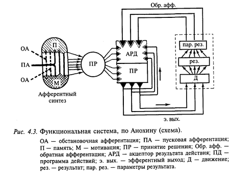 Лимбическая система в мозге человека выполняет очень важную функцию, которая называется мотивационно-эмоциональной. Чтобы было ясно, что это за функция, вспомним: каждый организм, включая организм человека, имеет целый набор биологических потребностей. К ним, например, относятся потребность в пище, воде, тепле, размножении и многое другое. Для достижения какой-то определенной биологической потребности в организме складывается функциональная система (рис. 4.3). Ведущим системообразующим фактором является достижение определенного результата, соответствующего потребностям организма в данный момент. Начальным узловым механизмом функциональной системы является афферентный синтез (левая часть схемы на рис. 4.3). Афферентный синтез включает доминирующую мотивацию (например, пищевую-поиск пищи и ее потребление), обстановочную афферентацию (событий внешней и внутренней среды), пусковую афферентацию и память. Память необходима для реализации биологической потребности. Например, щенка, которого только отняли от соска, невозможно накормить мясом потому, что он не воспринимает его как пищу. Только через некоторое количество проб (запоминается вид пищи, ее запах и вкус, обстановка и многое другое) щенок начинает употреблять в пищу мясо. Интеграция этих компонентов приводит к принятию решения. Последнее, в свою очередь, связано с определенной программой действия, параллельно с ней формируется также акцептор результатов действия, т.е. нервная модель будущих результатов. Информация о параметрах результата через обратную связь поступает в акцептор действия для сопоставления с ранее сформированной моделью. Если параметры результата не соответствуют модели, то здесь возникает возбуждение, которое через ретикулярную формацию мозгового ствола активирует ориентировочную реакцию, и происходит коррекция программы действия. Примеры некоторых биологических мотиваций будут приведены ниже.