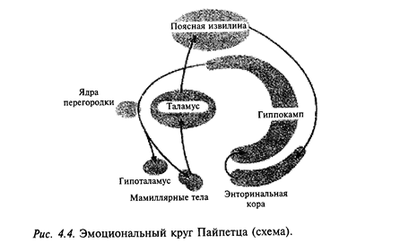 Организм имеет также специальный механизм для оценки биологической значимости биологической мотивации. Это эмоция. «Эмоции - особый класс психических процессов и состояний, связанных с инстинктами, потребностями и мотивами. Эмоции выполняют функцию регулирования активности субъекта путем отражения значимости внешних и внутренних ситуаций для осуществления его жизнедеятельности» (Леонтьев, 1970). Биологическим субстратом для осуществления этих важнейших функций организма служит группа мозговых структур, объединенных между собой тесными связями и составляющих лимбическую систему головного мозга. Общая схема структур лимбического мозга показана в приложении 4. Все эти структуры головного мозга участвуют в организации мотивационно-эмоционального поведения. Одной из главных структур лимбической системы является гипоталамус. Именно через гипоталамус большинство лимбических структур объединено в целостную систему, регулирующую мотивационно-эмоциональные реакции человека и животных на внешние стимулы и формирующую адаптивное поведение, построенное на основе доминирующей биологической мотивации. В настоящее время к лимбической системе относят три группы структур головного мозга. Первая группа включает филогенетически более старые структуры коры: гиппокамп (старая кора), обонятельные луковицы и обонятельный бугорок (древняя кора). Вторая группа представлена областями новой коры: лимбической корой на медиальной поверхности полушария, а также орбито-фронтальной корой на базальной части лобной доли мозга. К третьей группе относят структуры конечного, промежуточного и среднего мозга: миндалину, перегородку, гипоталамус, переднюю группу ядер таламуса, центральное серое вещество среднего мозга. Еще в середине прошлого столетия было известно, что повреждение структур гиппокампа, мамиллярного тела и некоторых других (сейчас мы знаем, что эти структуры входят в состав лимбической системы головного мозга) вызывает глубокие расстройства эмоций и памяти. В настоящее время глубокие нарушения памяти на недавние события в клинике повреждений гиппокампа называются синдромом Корсакова. Многочисленные клинические наблюдения, а также исследования на животных показали, что в проявлении эмоций ведущую роль играют структуры круга Пайпетца (рис. 4.4). Американский нейроанатом Пайпетц (1937) описал цепочку взаимосвязанных нервных структур в составе лимбической системы. Эти структуры обеспечивают возникновение и протекание эмоций. Он обратил особое внимание на существование многочисленных связей между структурами лимбической системы и гипоталамусом. Повреждение одной из структур этого «круга» приводит к глубоким изменениям в эмоциональной сфере психики. В настоящее время известно, что функция лимбической системы головного мозга не ограничивается только эмоциональными реакциями, но также принимает участие в поддержании постоянства внутренней среды (гомеостаза), регуляции цикла сон - бодрствование, процессах обучения и памяти, регуляции вегетативных и эндокринных функций. Ниже представлено описание некоторых из этих функций лимбической системы.