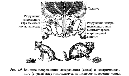 Регуляция пищевого поведения осуществляется рядом структур ЦНС и прежде всего двух взаимодействующих центров-центром голода (латеральное ядро гипоталамуса) и центром насыщения (вентромедиальное ядро гипоталамуса). Электрическая стимуляция центра голода провоцирует акт еды у сытого животного, тогда как стимуляция центра насыщения прерывает прием пищи. Разрушение центра голода вызывает отказ от потребления пищи (афагия) и воды, что часто приводит к гибели животного (рис. 4.9). Электрическая стимуляция латерального ядра гипоталамуса увеличивает секрецию слюнных и желудочных желез, желчи, инсулина, усиливает моторную деятельность желудка и кишечника. Повреждение центра насыщения увеличивает прием пищи (гиперфагия). Практически сразу после такой операции животное начинает есть много и часто, что приводит к гипоталамическому ожирению. На рис. 4.10 показаны две крысы: одна с нормальной массой тела, а другая - с гипоталамическим ожирением. При ограничении пищи масса тела уменьшается, но как только ограничения снимают, вновь проявляется гиперфагия, снижающаяся лишь при развитии ожирения. Эти животные проявляли также повышенную разборчивость при выборе пищи, предпочитая наиболее вкусную. Ожирение, следующее за повреждением вентромедиального ядра гипоталамуса, сопровождается анаболическими изменениями: изменяется обмен глюкозы, повышается уровень холестерина и триглицеридов в крови, снижается уровень потребления кислорода и утилизации аминокислот. Электрическая стимуляция вентромедиального гипоталамуса уменьшает секрецию слюнных и желудочных желез, инсулина, моторику желудка и кишечника. Таким образом, можно заключить, что латеральный гипоталамус вовлечен в регуляцию метаболизма и внутренней секреции, а вентромедиальный гипоталамус оказывает на нее тормозное влияние.