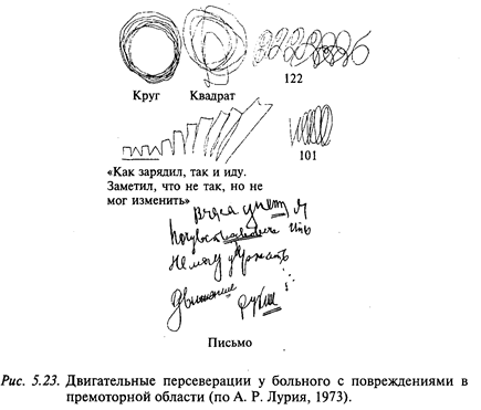 Поражение премоторных зон у человека не сопровождается параличом контралатеральных конечностей. Вместе с тем их основным симптомом является отчетливое нарушение двигательных навыков. Клинически это проявляется в том, что у больного изменяется почерк, машинистка теряет быстроту и плавность своей работы, квалифицированный рабочий не способен автоматизированно выполнять серию операций, входящих в привычный двигательный акт. В клинике такие симптомы описывают под названием «инертность двигательных стереотипов». Характерными являются невозможность больного переключаться, например, с сильных ударов на слабые при отстукивании ритма ладонью, а также своеобразное «заклинивание» движения, двигательная персеверация (рис. 5.23). Наиболее отчетливо нарушения проявляются в контралатеральной очагу руке, но при поражении левого (доминантного) полушария они часто проявляются в работе обеих рук. Клиницисты отмечают, что у таких больных сохранены как намерения выполнить движение, так и общий план его выполнения, однако в своей исполнительной части движение высвобождается из-под влияния двигательной программы.