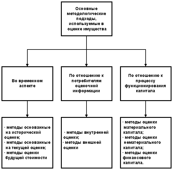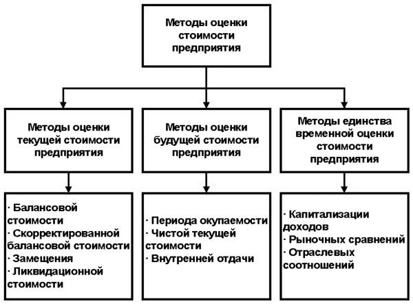 Вместе с тем, исходя из вышеприведенной схемы и принимая во внимание все многообразие других встречающихся в научной литературе видов и методов оценки, есть достаточные основания считать, что все они зародились и получили свое развитие на базе трех основных видов оценки: учетных (бухгалтерских); финансовых (бюджетных) и рыночных (маркетинговых) методов. Ниже рассмотрим более подробно, что представляют собой методы, включенные в каждую из указанных выше групп. В учетных методах, как правило, используется историческая и текущая оценка стоимости капитала предприятия посредством исчисления: себестоимости; остаточной стоимости; восстановительной стоимости; текущей рыночной стоимости; ликвидационной стоимости. Маркетинговые (рыночные) методы оценки стоимости чаще всего используют понятия текущей и будущей стоимости объекта. Они основываются на использовании: метода рынка капитала; метода анализа продаж (сделок); метода отраслевых коэффициентов.
