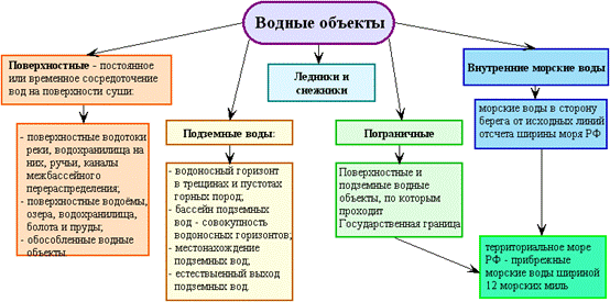 Водный объект вообще – это сосредоточение вод на поверхности суши в формах ее рельефа либо в недрах, имеющее границы, объем и черты водного режима. В состав водного объекта включаются поверхность воды, земли, покрытые водой, и сопряженные с ними дно и берега (ст. 7 Водного кодекса РФ). Как единый водный объект рассматриваются также подземные воды и вмещающие их горные породы. Из всей совокупности водных объектов к недвижимому имуществу Гражданский кодекс РФ относит только обособленные водные объекты (рис. 15). Обособленные водные объекты (замкнутый водоем) — небольшие по площади и непроточные искусственные водоемы, не имеющие гидравлической связи с другими поверхностными водными объектами. Они являются составной частью земельного участка.