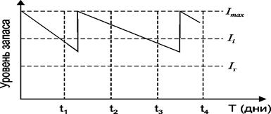 Рис. 7.2. Управление запасами (идеальные условия): t – интервал времени Графическая интерпретация системы управления запасами с фиксированным интервалом между заказами представлена на рис. 7.3. Данный вариант системы устанавливает некоторую промежуточную величину запаса (Ii) таким образом, что если в контрольной точке t имеющийся запас находится в интервале (I max – Ii), то заказ не производится.