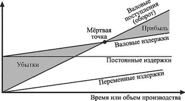 Рис. 9.1. График «мёртвой точки», или «точки рентабельности» При расчетах рентабельности и решении финансовых вопросов необходимо точно трактовать понятие «прибыль». Есть существенная разница между валовой и чистой прибылями: валовая прибыль представляет собой текущие доходы до уплаты налогов, чистая – после их уплаты, т. е. это те средства, которыми компания может располагать в полной мере и по своему усмотрению. В свою очередь, чистая прибыль в зависимости от выполняемых ею функций будет распадаться на распределяемую, т. е. идущую на выплату дивидендов или вообще в личные доходы владельцев фирмы, и не распределяемую, т. е. вкладываемую в производство. Каких-то особых рецептов относительно разделения частей прибыли не существует – все зависит от конкретных целей фирмы и ее финансового состояния. Можно лишь отметить что распределяемая прибыль составляет обычно 30–50 % чистой прибыли.