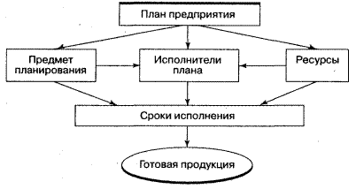 Рис. 11.2. Соотношение планирования и управления Аналогичное отношение к планированию и управлению производством наблюдается почти во всех странах. По утверждению канадского бизнесмена Д. Дойла, «план предпринимательского бизнеса является основой контракта между предпринимателем и финансистом-вкладчиком». План бизнеса – это общепринятый прием менеджмента, который используется корпорациями и учреждениями всех размеров для того, чтобы установить цель и предложить пути ее достижения. Он, как правило, составляется на несколько лет – обычно на 5 лет. Система хозяйственного управления в СССР, будучи передовой и прогрессивной с момента своего возникновения в 20-х гг., постепенно оказалась законсервированной и не способной реагировать на происходящие изменения, поскольку была скована идеологией, основанной в XIXв., использующей ресурсоограниченную, а не спросоограниченную систему хозяйствования. Современные прогрессивные методы «сетевого планирования», «точно в срок» и другие были разработаны и внедрены за рубежом. Распространенный в Японии метод «точно в срок» заключается в планировании и реализации различных услуг, поставок потребителю сырья, материалов, комплектующих изделий по точно установленному графику прямо на линии обработки, минуя складские запасы. Работа «с колес» вследствие запаздывания поставок, которая в России рассматривается как работа в аварийном режиме, в Японии считается обычным передовым методом. Расширяя международные экономические связи, необходимо усваивать и международные порядки, которые предусматривают высокое качество труда на каждом рабочем месте, конкурентоспособность продукции и строгое соблюдение дисциплины поставок. Использование планирования, передовых методов разработки и контроля выполнения плана – основной путь развития современного производственного менеджмента. Планирование производства и управление фирмой Переход производственных предприятий в России на условия рынка, полное самоуправление и самофинансирование означает самостоятельное обеспечение технического, производственного и социального развития за счет заработанных средств. Устанавливается прямая зависимость между ресурсами, эффективностью работы и доходами, которыми самостоятельно распоряжаются предприятия. Возрастает роль внутрипроизводственного планирования, с помощью которого связывается выпуск продукции на предприятии с потребностями рынка. Знать потребности рынка на перспективу и успеть вовремя доставить на рынок собственную продукцию – главная обязанность руководителей и специалистов предприятия. Планирование производства на предприятии (фирме) – это точное предвидение и программирование на перспективу хода производственного процесса и его результатов по этапам. В плане с учетом специализации и кооперации труда устанавливаются по датам четкое задание на выполнение конкретного вида и объема работы и расходования ресурсов каждому цеху, отделу, бригаде, рабочему и последовательность выполнения связанных между собой работ. С помощью плана, который всегда устремлен в будущее, на перспективу распределяются имеющиеся ресурсы – материальные, трудовые, финансовые и природные. Если, скажем, надо построить дом или перевезти 1 000 т груза из одного предприятия на другое, то составляется общ