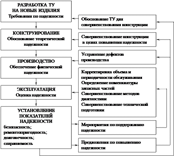 где t сум – суммарная наработка всех объектов; t рем – суммарное время простоев при ремонте; t обс – суммарное время обслуживания, К о.г = К г Р (t). (13.8) Необходимым является следующее требование: в течение средней продолжительности тушения пожара, равной 2 ч, не должно быть отказов пожарной техники. Это оценивается коэффициентом оперативной готовности К о.г = К г Р (t) ≥ 0, 96, (13.9) т.е. не менее 96 % всех ПА при тушении пожаров не должны иметь отказов. Управление надежностью. Надежность объектов закладывается при проектировании, обеспечивается при изготовлении и поддерживается при эксплуатации (рис. 13.14). При проектировании пожарной техники требуемый уровень надежности обеспечивается: рациональной схемой устройств или механизмов, использованием стандартных деталей. Кроме того, предусматривается ограничение режимов использования и введение в конструкцию ограничительных устройств и т.д. В обсуждении эскизных и рабочих проектов принимают участие специалисты ПО. Они проверяют выполнение требований технических условий в проектах. В производстве ПА контроль осуществляет военная приемка из представителей ГУ ГПС. Под их руководством производятся заводские испытания выпускаемых машин.