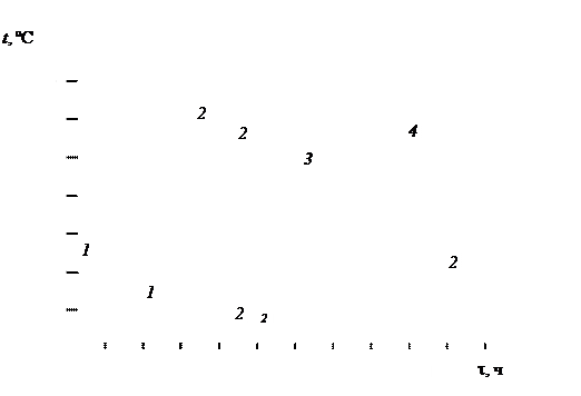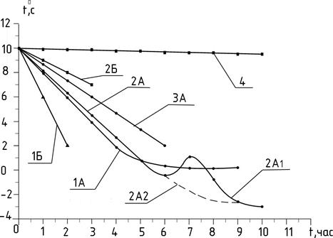 Рис. 13.22. Охлаждение огнетушащих веществ в АЦ-40(130)63Б: (t 0 = -27 º С; скорость ветра 4 – 6 м/с) А – стационарный режим; Б – транспортный режим 1 – вода в цистерне; 2 – пенообразователь ПО-6К в баке; 2 А1 – свежий Приняв предельно допустимую температуру охлаждающей воды в цистерне, равной 2 º С, холодоустойчивость ее в транспортном режиме будет равна 2 ч. В стационарном режиме холодоустойчивость достигает 4 ч, а при уменьшении скорости ветра до 1 м/с она увеличивается до 6 ч. В этих условиях следует, если предоставляется возможность, производить замену воды. Температура воды в цистернах, как следует из анализа кривых 1 и 3 на рис. 13.23, не достигает температуры воздуха в гараже в течение десятков часов. Особо следует рассмотреть процесс охлаждения воды в цистернах объектовых пожарных частей. В этих пожарных частях автоцистерны ежедневно выполняют функции подвижного целевого дозора. Нередко это осуществляется 2-3 раза в сутки. При этом вне гаража АЦ находятся