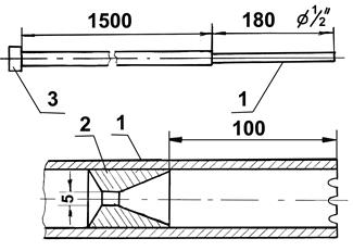 Рис. 13.23. Нагрев воды в цистерне АЦ-40(130)63Б в гараже: 1 – нагрев в гараже; 2 – выезд из гаража; 2а – нагрев воды в гараже; Тушение пожара. Низкие температуры воздуха оказывают большое воздействие на организацию и тушение пожаров. Они влияют во многих случаях на обеспечение забора воды как из открытых водоемов, так и из пожарной водопроводной сети. Возможны также отказы насосов в системе забора воды. Кроме того, особенно при тушении крупных пожаров, уменьшается подача воды по рукавным линиям. Возможны отказы в работе систем насоса. Сказываются зимние условия и на техническом обслуживании ПА. Трудности забора воды происходят по различным причинам. Если при постановке АЦ в боевой расчет после тушения пожара не были полностью удалены остатки воды в вакуумном кране и трубке, соединяющей его с газоструйным вакуумным аппаратом, то при следовании на пожар уже через 5-8 мин образуются ледяные пробки. Вакуумная система не обеспечит забор воды. Для предотвращения этого отказа необходимо при возвращении в пожарную часть после тушения пожара, слив воду из насоса, на 3 – 5 с включить газоструйный вакуумный кран. При этом сконденсировавшаяся влага в трубопроводе будет удалена. Перед наступлением зимы следует предусмотреть возможные подъезды к естественным водоисточникам, а также образовать незамерзающие проруби. Для этого на льду делается прорубь, стенки которой могут быть армированы досками. В образовавшуюся полынью забрасывают торф, мелкие древесные отходы и т.д. Они облегчат разрушение образовавшегося в полынье льда. При наличии в регионе водопроводной пожарной сети должны утепляться гидранты: торфом, стекловатой и т.д. В пожарных частях должны быть предусмотрены устройства для очистки гидрантов от образовавшегося льда. В этих целях могут быть использованы отработавшие газы двигателя АЦ или вода, подаваемая в колодец гидранта от пожарного насоса. Это может осуществляться приспособлениями, показанными на рис. 13.24 и 13.25. На рис. 13.24 представлена конструкция из труб для подвода воды из насоса АЦ в гидрант. Для создания мощной струи в наконечнике 1 закреплена вставка 2 с отверстием 5 мм. Труба полугайкой 3 соединена с напорным рукавом длиной 5 – 10 м, который соединяется напорным патрубком АЦ.