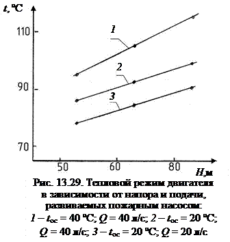 1 – вода из естественного водоисточника; 2 – вода подогретая На пожарах возможно замораживание напорных рукавов при разборке рукавных линий. Для его предотвращения следует разбирать рукавную линию, не прекращая протекания воды. Рукава, скатанные в скатку, меньше подвержены разрушению, чем в случае, когда они замерзнут и их необходимо транспортировать в нескатанном состоянии. Подача воды насосом при тушении пожаров в летних условиях может ограничиваться вследствие перегрева охлаждающей жидкости двигателя. Ее температура t о.ж зависит от ряда факторов t о.ж = 35, 8 + 0, 575 t ос + 0, 363 Н + 0, 45 Q, (13.18) где t ос – температура окружающего воздуха, º С; Н – напор, развиваемый насосом, м; Q – подача насоса, л/с. Зависимость нагрева охлаждающей жидкости двигателя от величины Н и Q представлена на рис. 13.29. Из его рассмотрения следует, что практически при максимальных подачах воды насосом до t ос < 40 º С перегрева двигателя не должно быть. Техническое обслуживание и ремонт ПА во многом зависят от природно-климатических условий. Климатические факторы оказывают большое влияние как на долговечность и надежность пожарной техники, так и на работоспособность Таблица 13.7