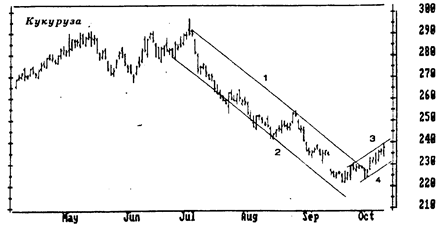 Рис. 9. Диапазоны тренда и предварительные линии тренда Нисходящая линия тренда 1, проведенная через максимумы подъемов, характеризует рынок " медведей" на кукурузу. Линия диапазона 2 проведена через минимумы параллельно линии тренда. Она отслеживает максимальную силу медведей в нисходящем тренде. Лучшие возможности для продажи - в верхней половине падающего диапазона, а для покупки - в нижней половине растущего. Линии тренда можно применить и к объему и индикаторам. Наклон линии тренда для объема показывает, больше или меньше людей проявляет интерес к рынку. Растущий тренд в объеме подтверждает действующий тренд. Падающий объем указывает не. то, что рыночная толпа отказывается следовать за трендом. Из всех технических индикаторов Индекс Относительной Силы (Relative Strength Index-RSI) лучше других подходит для анализа линий тренда. Его линии тренда часто прерываются раньше, чем линии трендов на графиках цен, давая раннее предупреждения об изменении направления движения рынка.