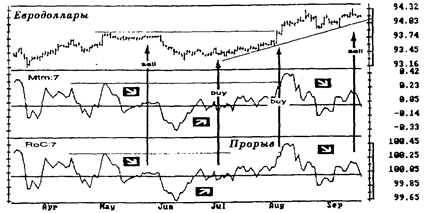 Рис. 25. 7-дневный моментум (Mtm: 7) и скорость изменения (RoC: 7) Когда моментум или RoC растут, это означает, что подъем цен ускоряется. Когда они падают, это показывает, что спад цен ускоряется. Максимумы и минимумы этих индикаторов показывают, когда тренд достиг максимальной скорости. Когда моментум или RoC разворачиваются и идут в обратном направлении, пора начинать обратный отсчет перед разворотом цен. Эти индикаторы дают самые лучшие сигналы, когда расходятся с ценами (отмечено стрелками).