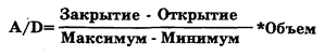 Пока OBV идет в ногу с ценами, он подтверждает тренд. Восходящий тренд OBV подтверждает рост акции. Ее конец в марте дает сигнал к продаже. Около вершины есть два сигнала к началу игры на понижение. Первый, в начале апреля, дается дивергенцией " медведей" между OBV и ценами. Через две недели OBV преодолевает свой уровень поддержки, давая еще один сигнал продавать. Нисходящая линия тренда OBV подтверждает падение акций Apple Computer, продолжайте игру. Прорыв вверх в июле дает " сигнал закрытия позиции и игры на повышение. 1. Когда OBV достигает нового максимума, это подтверждает силу " быков", предвещая, что цены,, вероятно, будут расти дальше, и дает сигнал к покупке. Когда OBV достигает нового минимума, это подтверждает силу " медведей", предвещая. грядущее падение цен и дает сигнал к продаже. 2. OBV дает самый сильный сигнал к покупке или продаже, когда, он расходится с ценами. Когда цены растут, затеян откатываются и вновь растут, давая новый более высокий максимум, в котором OBV достигает менее высокого значения, чем в предыдущем максимуме, возникает дивергенция " медведей", являющаяся сильным сигналом к продаже. Когда цены падают, затем подскакивают и вновь падают к новому минимуму, а OBV дает менее глубокий минимум, чем при предыдущем падении, зто указывает на дивергенцию " быков" и дает сильный сигнал к покупке. Долгосрочные дивергенции важнее краткосрочных. Дивергенции, формирующиеся в течение нескольких недель, дают более сильные сигналы, чем проявляющиеся в течение нескольких дней. 3. Когда цены находятся в пределах коридора, а OBV вырывается к новому максимуму, это дает сигнал о покупке. Когда цены держатся в пределах коридора, а OBV дает новый минимум, прорываясь вниз, это дает сигнал о продаже. Показатель накопления/распределения Этот индикатор создан Л. Вильямсом и описан в книге, изданной в 1972 году, «Как я сделал миллион долларов». Он был разработан как основной индикатор для акций, но некоторые аналитики применили его и к фьючерсам. Уникальность показателя накопления/распределения (A/D) в том, что он связывает цены открытия и закрытия с объемом. Если цена закрытия выше цены открытия, то день выиграли " быки" и A/D положителен. Если цена закрытия ниже цены открытия, то выиграли " медведи" и A/D отрицателен. Если цена закрытия равна цене открытия, то победителя нет и A/D равен 0. Итоговая сумма A/D за каждый день и дает интегральный индикатор накопления/расхода. A/D награждает " быков" и " медведей" только частью дневного объема. Эта часть зависит от интервала цен за день и от расстояния от цены открытия до цены закрытия. Чем больше расстояние между ценами открытия и закрытия по отношению к дневному интервалу цен, тем больше изменение накопления/расхода.