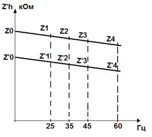 С некоторыми допущениями можно принять, что полное сопротивление тела человека на частотах 0 - 100 Гц находится в линейной зависимости от частоты тока и может быть определено методом экстраполяции. С этой целью в линейном масштабе строится график зависимости полного сопротивления от частоты, как показано на рис.15. Значение Z 0 находится при пересечении прямой z1 - z4 с осью координат. Рис. 15. График экстраполяции при определении сопротивления тела человека постоянному току г) Значение полного сопротивления наружного слоя кожи ZH при данной частоте может быть найдено из выражения
