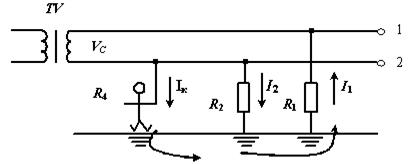 Из этих выражений можно сделать выводы: 1. Прикосновение человека к проводу с большим сопротивлением изоляции относительно земли более опасно, что видно из выражения (5). 2. Если предположить, что R 1 = R 2 = RИЗ, тогда выражения (5) и (6) примут вид