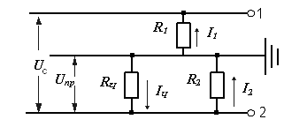 Примером такой сети может служить электрическая сеть небольшой протяженности напряжением до 1000 В. Такие сети используются для питания сверхнизким (малым) напряжением 12, 24, 36 и 42 В ручных переносных ламп, переносного электроинструмента и др. Схема замещения приведена на рис. 29. Требуется оценить опасность прикосновения человека к одному из проводов этой сети, т.е. определить напряжение прикосновения UПР, под которым окажется человек, и ток IЧ, проходящий через него. В общем случае при нормальном режиме работы сети напряжение прикосновения и поражающий ток могут быть определены из выражений