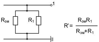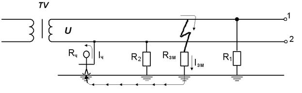 Следовательно, чем выше значение RИЗ, тем меньше значение UПР, значит меньше опасность поражения человека током (меньше IЧ). Согласно правил устройства электроустановок (ПУЭ) минимально допустимое сопротивление изоляции электроустановок, аппаратов, вторичных цепей и электропроводок напряжением до 1000 В должно быть, как правило, не менее 0, 5 МОм. При аварийном режиме (рис. 30.) один из проводов сети, например 1, замкнут на землю через сопротивление замыкания RЗМ.