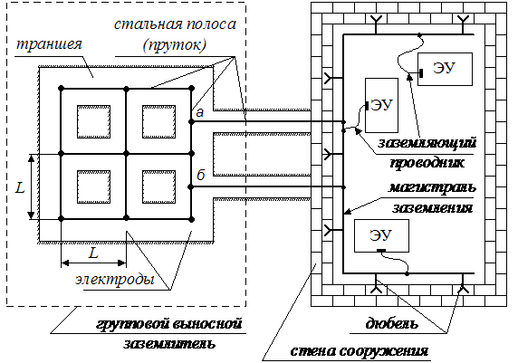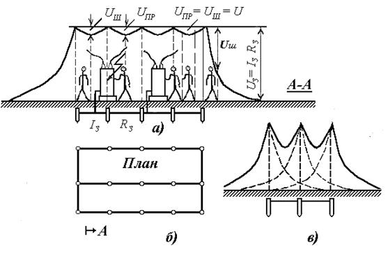 Иногда при выполнении контурного заземления внутри контура прокладывают горизонтальные полосы, которые дополнительно выравнивают потенциалы внутри контура (рис. 50). Рис. 50. Заземляющее устройство с выравниванием потенциалов внутри контура (сетка): а - план; б - форма потенциальной кривой Заземляющим устройством называется совокупность заземлителя и заземляющих проводников. Заземлителем называется проводящая часть или совокупность соединенных между собой проводящих частей, находящихся в электрическом контакте с землей непосредственно или через промежуточную проводящую среду (рис. 50). Защитным заземляющим проводником называется проводник, предназначенный для защитного заземления. Магистралью заземления называется защитный заземляющий проводник с двумя или более ответвлениями.