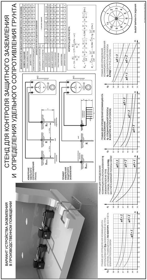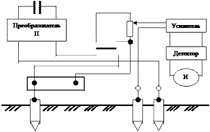Измерение сопротивления растеканию тока с заземлителей. В лаборатории имеется лабораторная установка (ЛУ) с разными приборами для выполнения данной работы. Принцип действия приборов одинаков, хотя и есть внешние конструктивные отличия. Рассмотрим ЛУ, изображенную на рис. 60, в которой для выполнения задания применяется широко распространенный на практике измеритель заземления М-416 (Ф4103), предназначенный для измерения сопротивления заземляющих устройств и для определения удельного сопротивления грунта. Прибор имеет четыре зажима: два токовых, обозначенных I 1 и I 2 и два потенциальных - E1 и E2. Измеритель сопротивления М-416 имеет четыре диапазона измерения: 0, 1 - 10 Ом; 0, 5 - 50 Ом; 10 - 1000 Ом. Принцип действия основан на компенсационном методе с применением вспомогательного заземлителя и потенциального электрода (зонда), рис. 61.