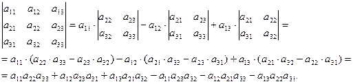 Первое слагаемое, входящих в правую часть со знаком плюс, есть произведение элементов главной диагонали матрицы А, следующие два — произведение элементов, лежащих на параллели к этой диагонали, и элемента из противоположного угла матрицы. Слагаемые, входящие в (3.1) со знаком минус, строятся таким же образом, но относительно побочной диагонали. Данному правилу соответствуют схемы, облегчающие вычисление слагаемых: