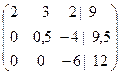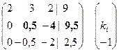 Это прямой ход исключения Гаусса. На обратном ходе значения переменных определяются в обратном порядке (снизу вверх). Из третьего уравнения Процедуру прямого хода можно представить в матричной форме. Исключение переменных осуществляется путем вычитания предварительно умноженной на коэффициент ki строки, соответствующей исключаемой переменной, из нижних строк