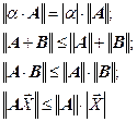 т.е. норма матрицы характеризуется максимальным по модулю образом единичного вектора. Отсюда понятно соотношение Используются три способа вычисления нормы матрицы. 1. Кубическая норма (норма по строкам) равна максимальной сумме модулей элементов строк 2. Октаэдрическая норма (норма по столбцам) равна максимальной сумме модулей элементов столбцов, 3. Сферическая норма (Евклидова норма). Свойства норм матрицы: