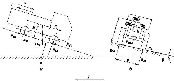 Так как (Gg) n = Gg cosb, (6.59) (Gg) t = Gg sinb, (6.60) Pj= G (v2/R) (6.61) (R – радиус поворота ПА), то для движения ПА без опрокидывания необходимо выполнение условий: tgb £ B/ 2 H; (6.62)