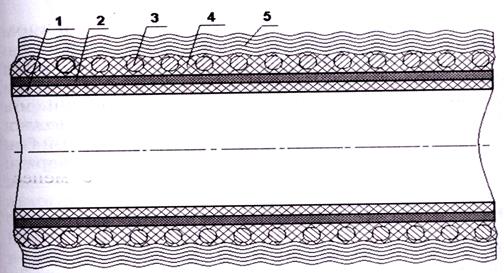 Рис 1. Схема расположения конструктивных элементов всасывающих и напорно-всасывающих рукавов: 1 -. внутренняя резиновая камера; 2 — текстильный слой; 3—проволочная спираль; 4— промежуточный резиновый слой; 5 — текстильный слой