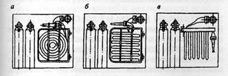 Схемы укладки рукавов при ох размещении в пожарных шкафах: а — двойная скатка; б — горизонтальная «гармошка»; в — вертикальная «гармошка»